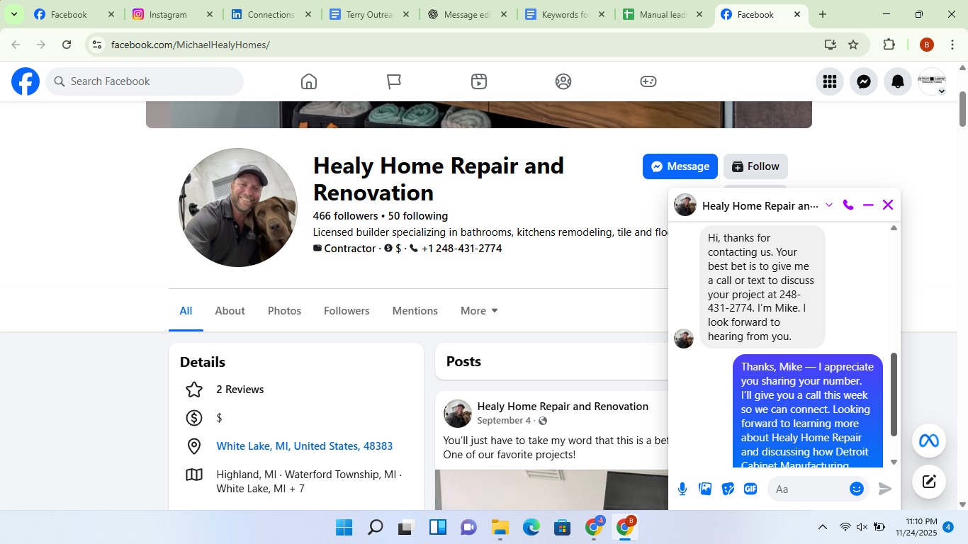 The $400/month plan covers both Facebook and LinkedIn simultaneously. The setter divides daily hours across both platforms based on where your audience is most active.
