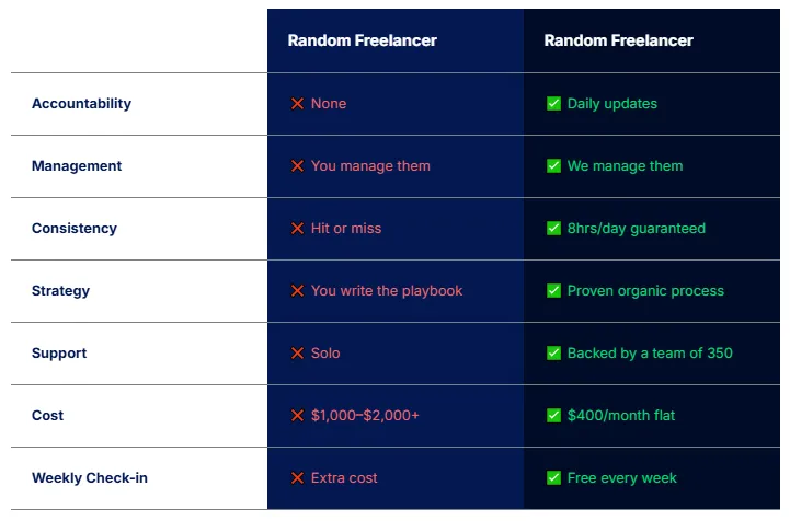 We don't just give you a VA. We give you a fulfillment partner that grows with your agency. I've seen too many agency owners stuck in the 'fulfillment trap'—unable to sell because they're too busy clicking buttons."